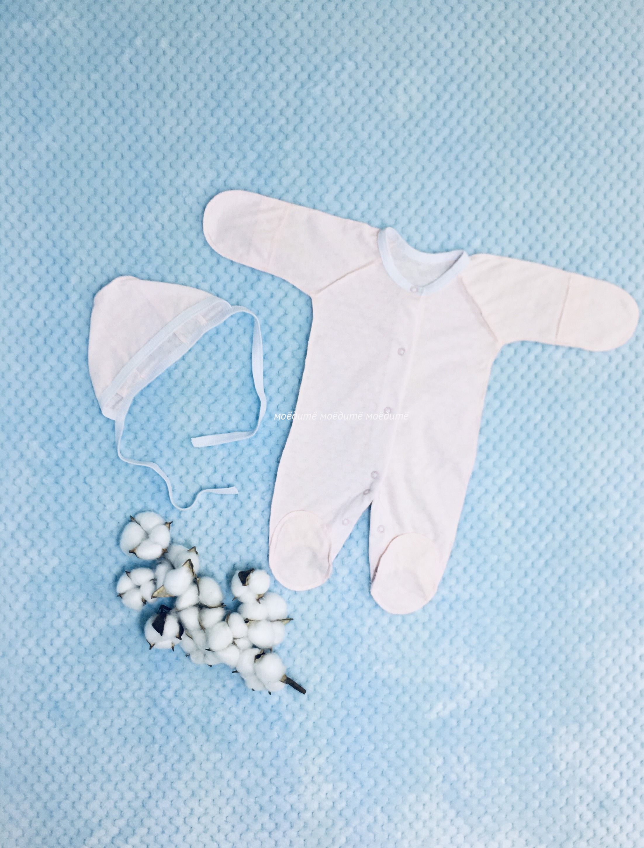 В комплект входит: удобный комбинезончик на кнопочках спереди и между ножек, чепчик на завязках.